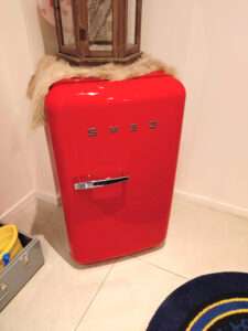 ⇩『冷たいドリンクは、可愛い赤の冷蔵庫の中から選びます』