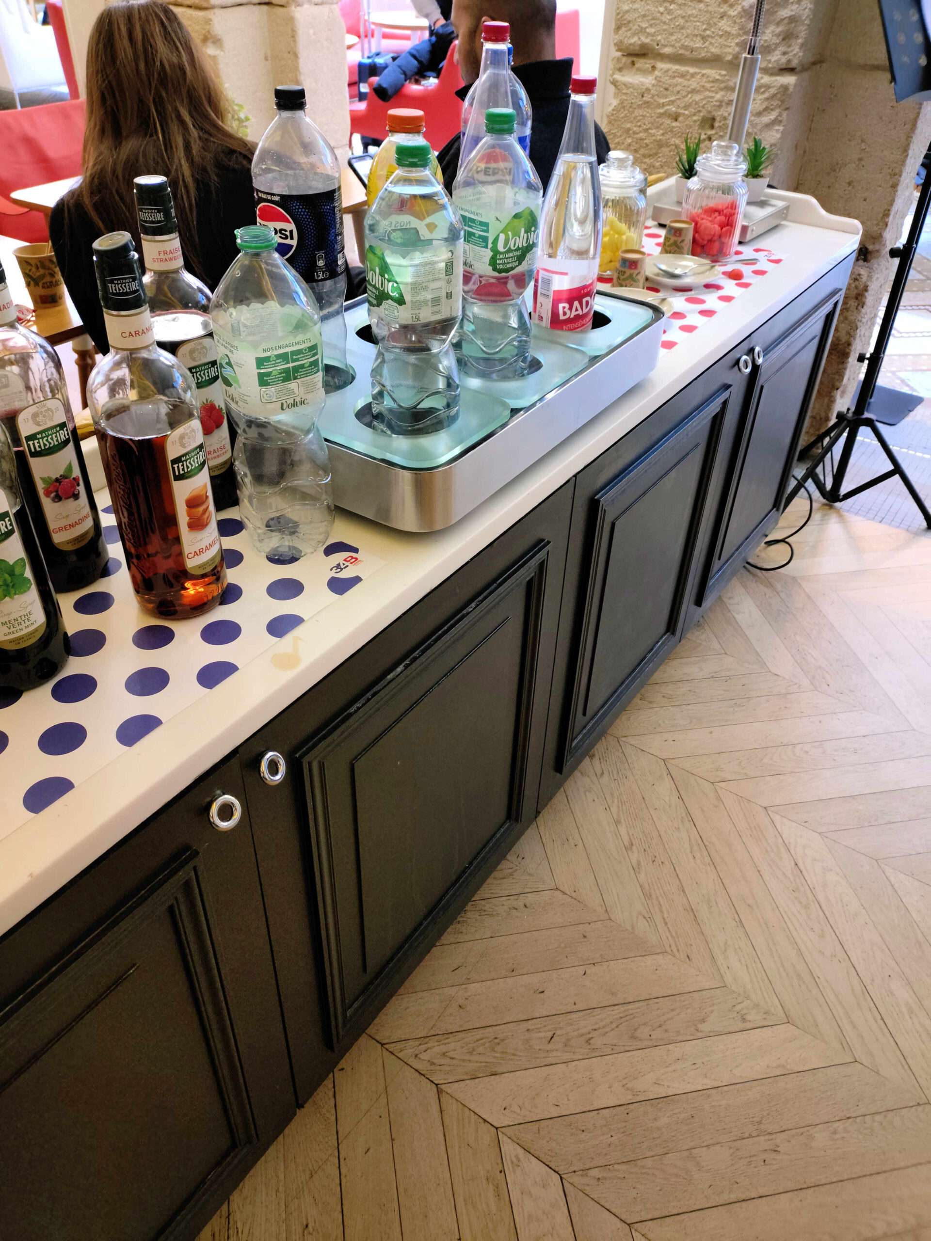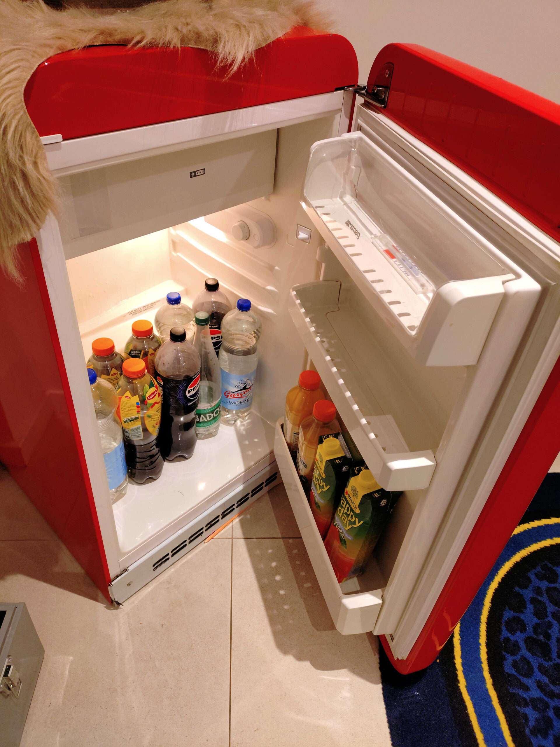 一見、ロビーのお洒落なインテリアと勘違いしそうな感じですが、冷蔵庫はちゃんと作動していて冷たいドリンクが多数入っていますので、お好きな物を取り出して注いでください。