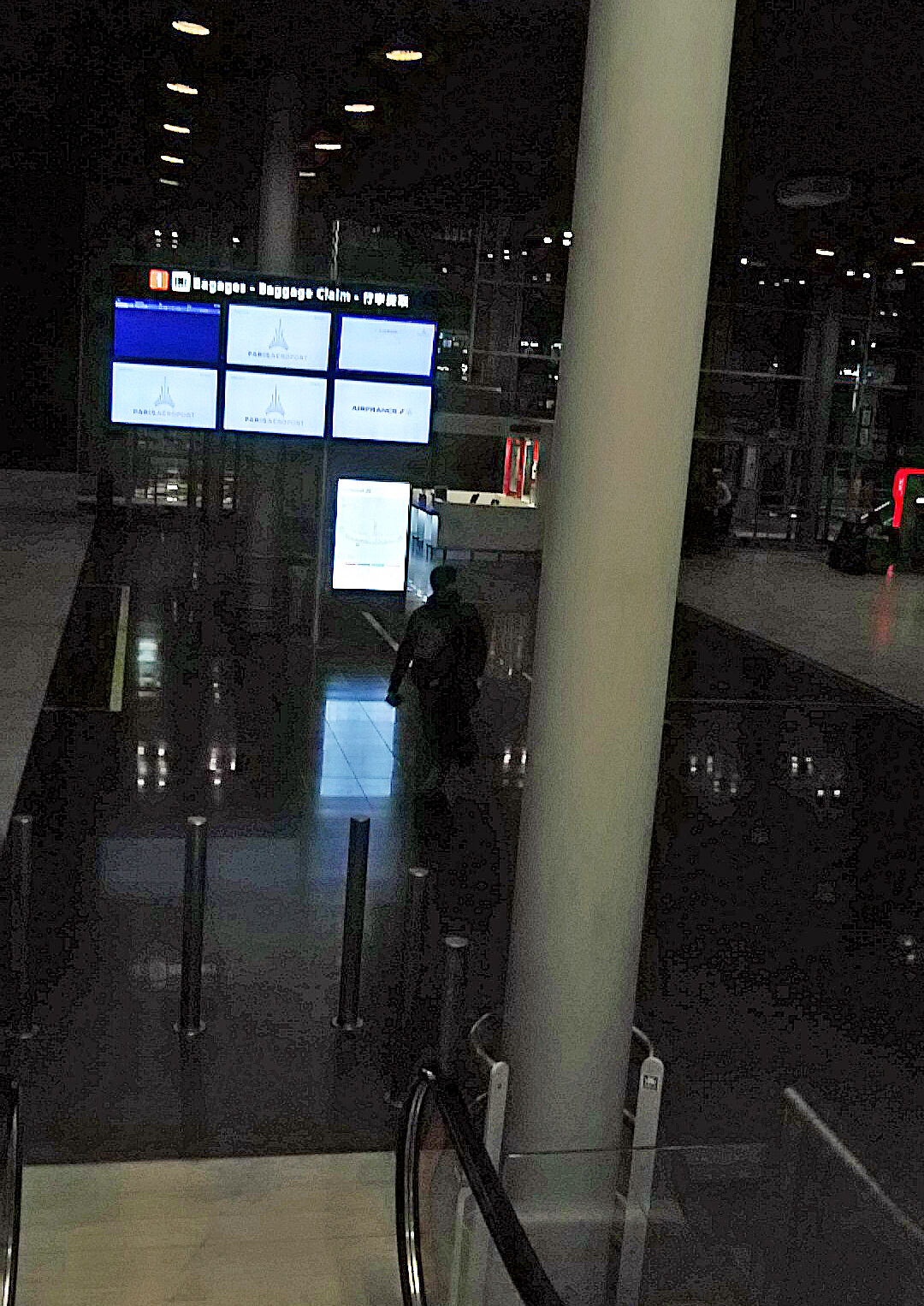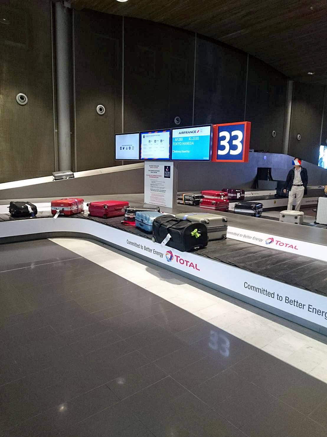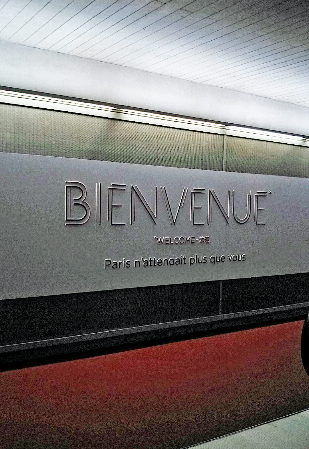 機内を降りたら、可愛いエスカレーターとトリコロールのフランス語がお出迎え。