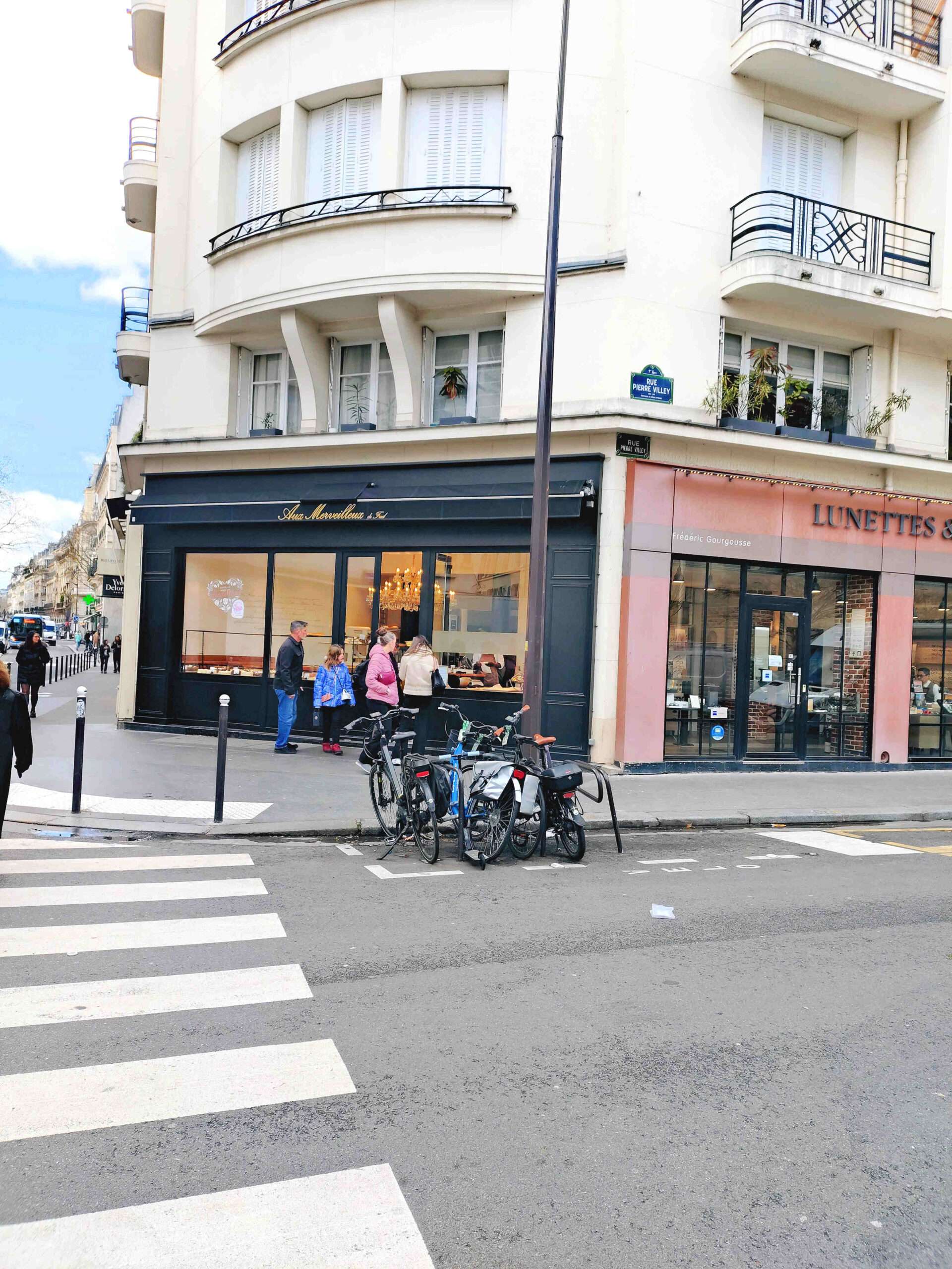 しばらくすると、前方右手に『Aux Merveilleux de Fred(オー・メルヴェイユ・ドゥ・フレッド)』サン=ドミニク通り店が見えてきます。