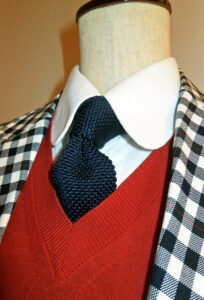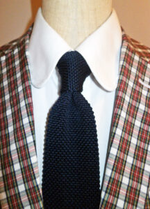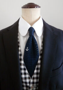 無地ネイビーのニットタイは、(チェック柄のジャケット)に合わせてもお洒落です。