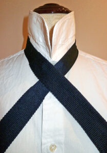 ①まずは、くるりと首に巻いて、大剣(太い幅の方)が上に来るようにしてください。