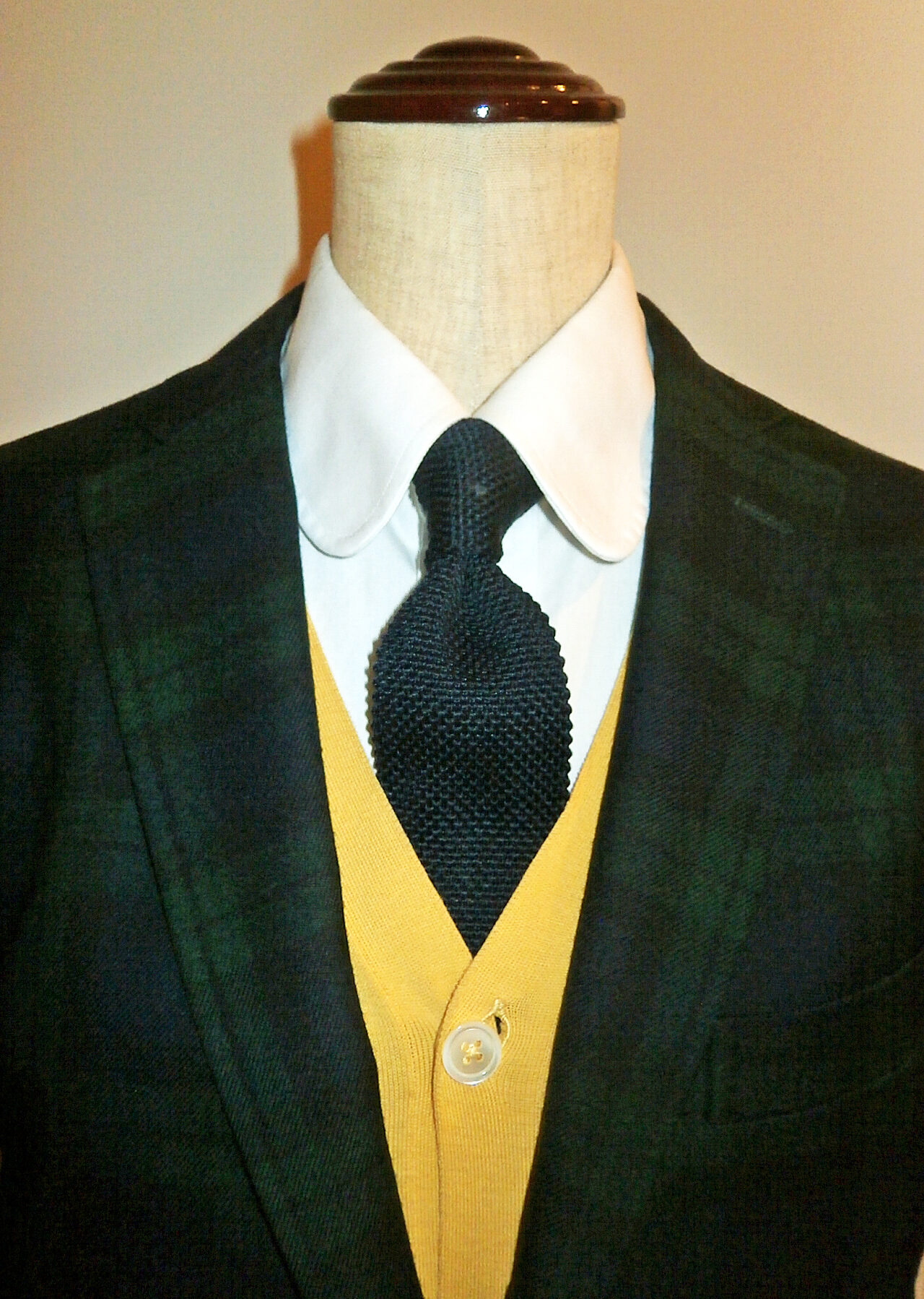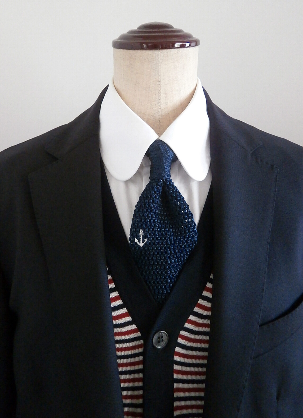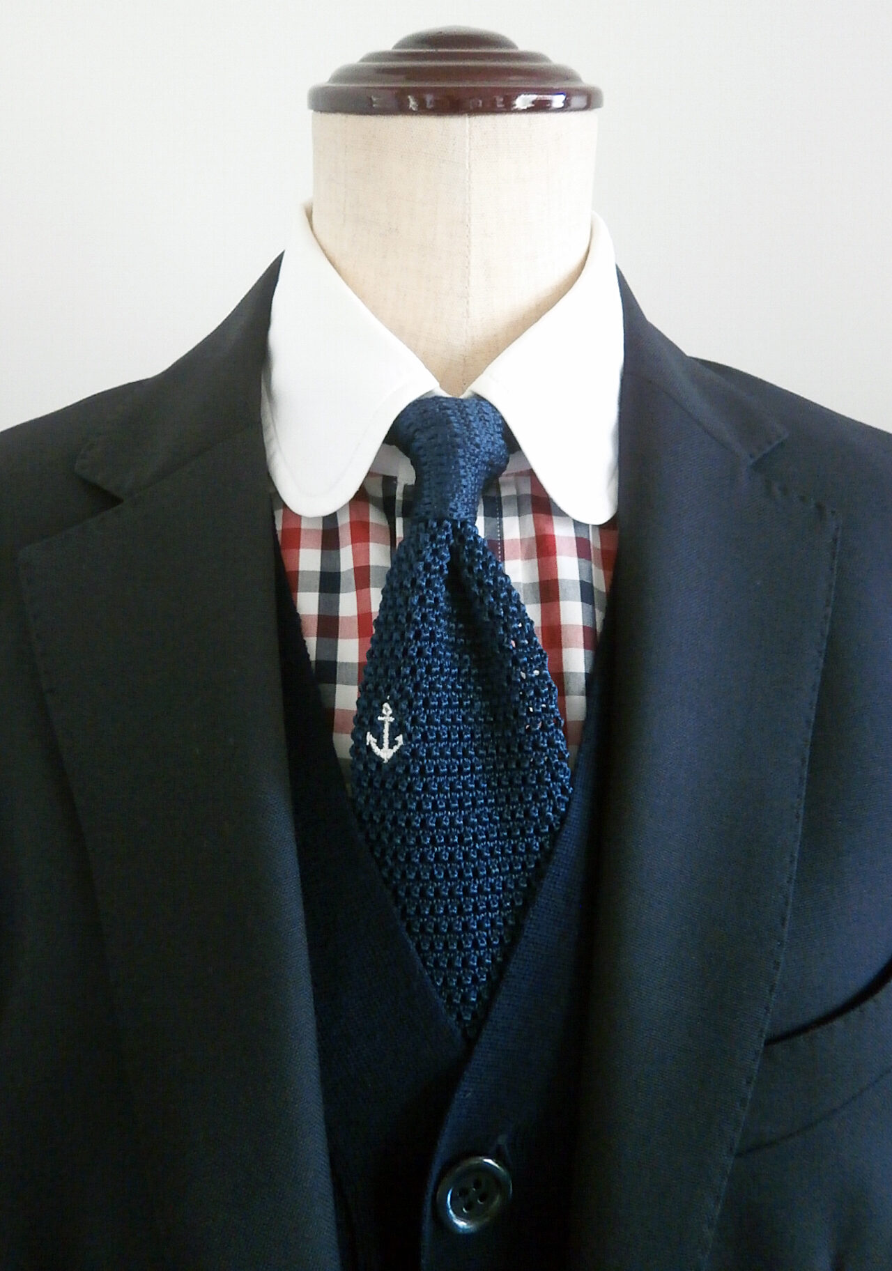 綺麗な色のニットをスタイリングすると、ネイビーのニットタイを、より際立たせて見せる事が出来ます。