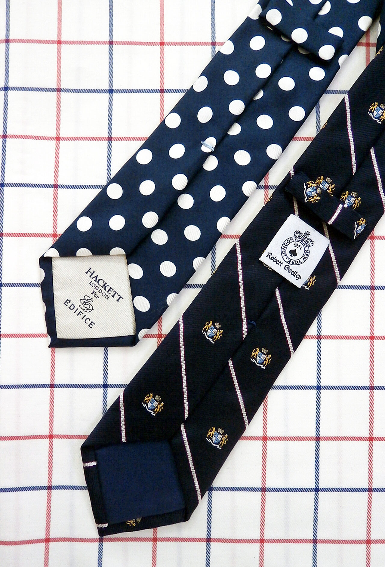ストライプと小紋柄が入った(ロイヤルクレストタイ)と(ドット柄)が有ると便利です。