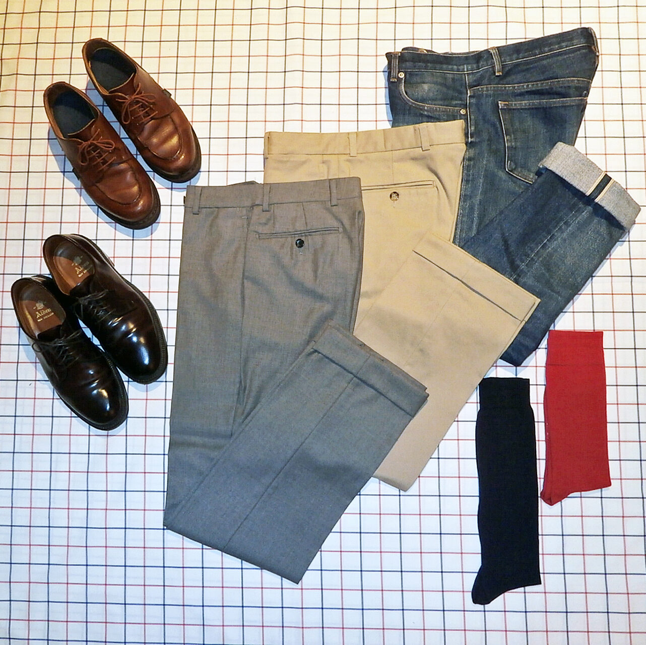 合わせるボトムスは(グレーのスラックス)(ベージュのチノパン)(ジーンズ)だけ。